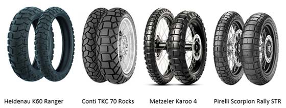 Straßenorientierte Hochgeschwindigkeits-Enduroreifen sind wenig geeignet, denn ein ordentlicher Sturzregen kann auch gute Pisten sehr schnell in gröbstes Geläuf verwandeln. Rallyereifen mit extrem hohem Negativprofil bieten zwar beste Traktion auf losem Untergrund, jedoch meist nur bescheidene Lebensdauer und Fahreigenschaften auf der Straße. Sandreifen vom Schlage eines Michelin Dessert sind nicht erforderlich.